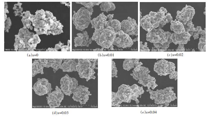 | 图 2 Li(Ni1/3Co1/3Mn1/3)1-xMgxO2的SEM照片 |