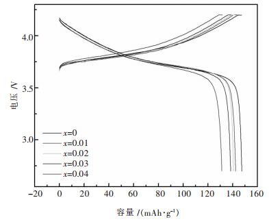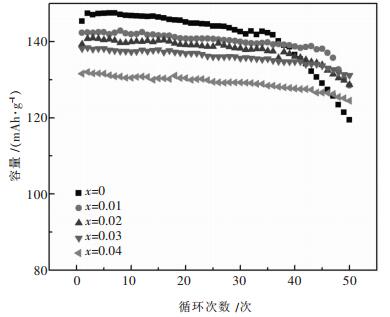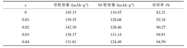 正极材料的放电容量如表 3所示.由表 3可知, 当掺杂量x=0.03时, 循环性能最优, 充放电循环50轮之后正极材料的放电比容量为131.1 mAh/g, 保持率为94.91 %, 高于未掺杂正极材料的119.5 mAh/g和82.21 %.掺杂量进一步增大, 正极材料仍能保持良好的循环性能.
