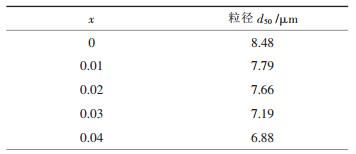 粒度测试结果如表 2所示.由表 2可知, 随着掺镁量的增加, 颗粒粒径有所下降.原因可能是在强碱性溶液中, Mg2+与NH3的配位作用较弱, 在金属离子总浓度不变的情况下, 游离的金属离子浓度增加, 溶液过饱和度升高, 成核速率加快, 生长速率有所降低, 颗粒粒径减小[13].