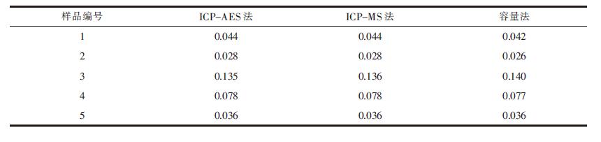 2.12 结果比对ICP-MS法与ICP-AES法及容量法样品结果比对,见表 14.