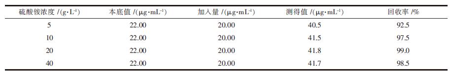 2.2 硫酸铵浓度的选择在统一样(1#)中加入1.00mL混合稀土溶液(2mg/mL)然后按照实验方法,考察5g/L、10g/L、20g/L、40g/L硫酸铵溶液对离子型稀土原矿中离子相稀土总量的浸出量,结果见表5.