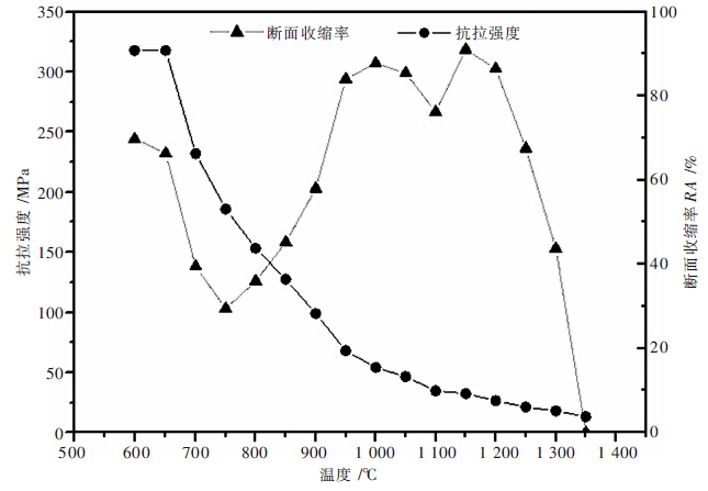 1.3 测试步骤(1)试样放置好后,抽真空,以10 ℃/s的速度加温至1 350 ℃并保温3 min,再以3℃/s的速度降至试验温度,保温1 min后,以1×10-3/s的形变速率进行拉伸变形,直至试样拉断.(试验温度点:600 ℃,650 ℃,700 ℃,750 ℃,800 ℃,850 ℃,900 ℃,950 ℃,1 000 ℃,1 050 ℃,1 100 ℃,1 150 ℃,1 200 ℃,1 250 ℃,1 300 ℃和1 350 ℃)