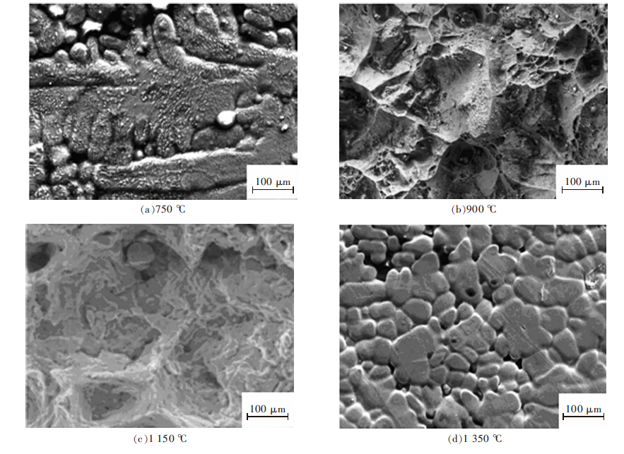 | 图 2 钢分别在750 ℃、900 ℃、1150 ℃、1350℃拉伸时的断口形貌 |