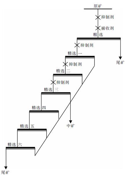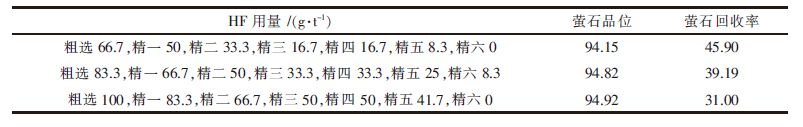 由表 6 的 HF 用量条件试验结果可知,随着 HF 用量的增加,萤石精矿的品位逐渐上升,回收率下降,综合考虑萤石精矿的品位和回收率,确定 HF 的用量为 : 粗选 83.3 g/t,精选一 66.7 g/t,精选二 50.0 g/t,精选三 33.3 g/t,精选四 33.3 g/t,精选五 25.0 g/t,精选六 8.3 g/t.
