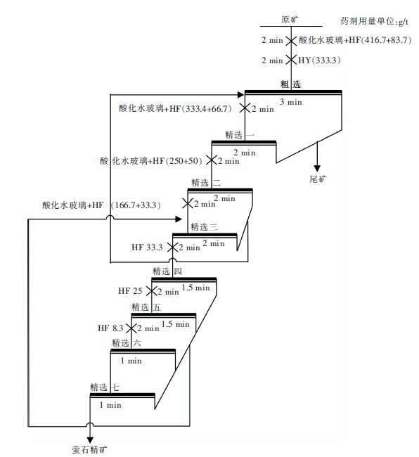 (2) 浮选试验研究包括捕收剂种类和用量条件试验,抑制剂种类和用量条件试验,最终选定 HY 作为萤石粗选捕收剂,用量为 333 g/t,酸化水玻璃+HF 作为萤石粗选和精选抑制剂,HF 的用量为:粗选 83.3 g/t,精选- 66.7 g/t,精选二 50 g/t,精选三 33.3 g/t,精选四 33.3 g/t,精选五 25 g/t,精选六 8.3 g/t.