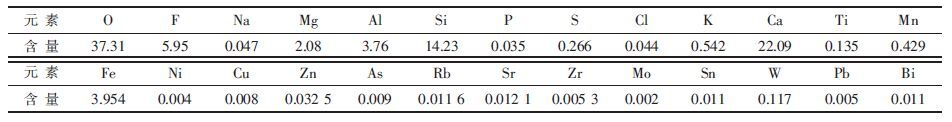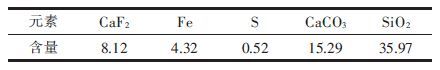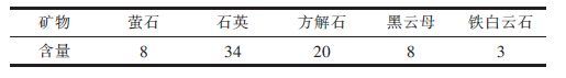 通过显微镜观察,鸽尾矿中主要含有萤石 、 石英 、 方解石 、 黑云母 、 铁白云石等矿物,各矿物含量见 表 3.