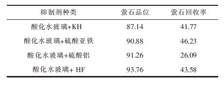 由表 5 可知,酸化水玻璃 +KH 或酸化水玻璃 +硫酸亚铁做抑制剂获得的萤石精矿品位不够,酸化水玻璃 + 硫酸铝获得的萤石精矿品位回收率较低,而酸化水玻璃 +HF 能明显地抑制脉石矿物,获得的萤石精矿回收率和品位均远高于使用其他抑制剂,因此最终确定酸化水玻璃 +HF 作为萤石浮选抑制剂.