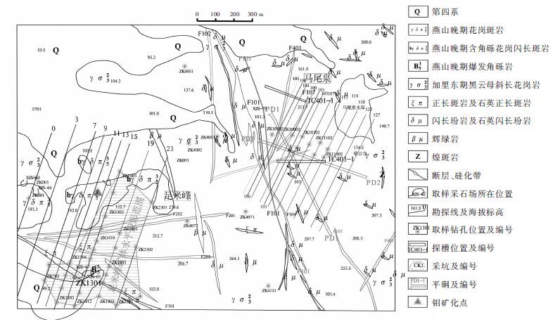 1.1.3 岩浆岩区内岩浆岩主要为加里东期和燕山期岩体。加里东期交代侵入岩属原地至半原地重熔花岗岩,岩体内部岩性主要为斜长花岗岩,边部岩性主要为黑云母二长花岗岩,向外过渡为均质阴影状混合岩、条带状混合岩。燕山期岩浆作用强烈,对成岩时间缺少准确的年龄资料。燕山期侵入岩均为一系列小型侵入体,规模虽小,但岩石种类繁杂,且与钼铜多金属矿化关系密切。据矿区铜钼矿普查报告资料[①]矿区共发现6个大小不一的瘤状爆发角砾-斑岩体(见图 1),其中朱家、熊家山、马窑、足米峰4个爆发角砾-斑岩体分布在熊家山-足米峰一带,呈“之”字形折线状在1 350 m的范围内作北西西向延展,分别由爆发角砾岩、花岗闪长斑岩、含砾花岗闪长斑岩组成。而熊家畈岩体、足米峰岩体的西部分枝、付家岩体则处在一条近南北向的直线上,分别由花岗闪长斑岩、含砾花岗闪长斑岩和爆发角砾岩组成。