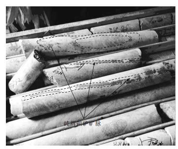 矿区矿石的构造主要为细(网)脉状构造、细(网)脉浸染状构造、浸染状构造等(图 3)。由于含矿主岩不同矿石还具块状构造、片麻状构造、条带状构造、条痕状构造、斑杂构造等。