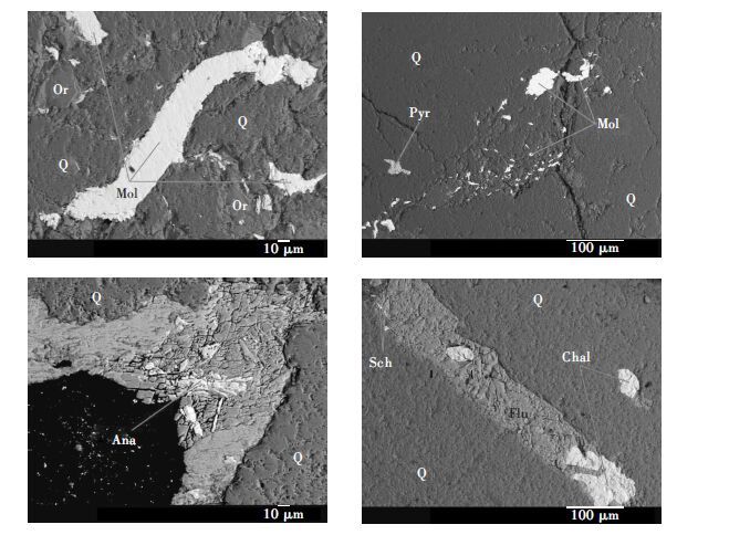 | Q-石英;Or-钾长石;Flu-萤石;Mol-辉钼矿;Chal黄铜矿;Sch-白钨矿;Ana-锐钛矿(金红石);Pyr-黄铁 图 3 熊家山钼XJS-19样品矿石电子探针背散射图 |