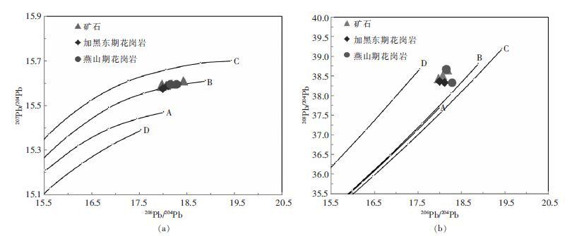 3.2 铅同位素示踪成矿物质来源除样品XJS-46的208Pb/204Pb比值较高外,其余矿石样品的铅同位素比值与燕山期花岗岩基本一致可能反映成矿与燕山期花岗岩有关,但也明显受到加里东期花岗岩的影响(图 5),这是因为加里东期花岗岩是主要的容矿围岩之一。样品XJS-46较高的208Pb/204Pb比值可能也是地层放射性成因铅加入的结果。因此,从矿石与燕山期花岗岩和加里东期花岗岩的铅同位素组成关系看,熊家山钼矿床铅的来源主要与燕山期花岗岩有关,但在成矿过程中混入了一些上地壳岩石中的铅。