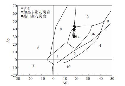 在Zartman et al(1981)的铅构造模式图中(图 5),熊家山钼矿床矿石铅与燕山期花岗岩和加里东期花岗岩均显示造山带铅的特征;在Zartman et al(1981)铅同位素组成构造环境判别图也落入造山带铅的分布范围(图 6);在铅同位素的 Δγ-Δβ成因分类图解中[9],落入俯冲带的岩浆作用成因铅源区与造山带铅和上地壳铅的过渡位置(图 7)。因此,熊家山钼矿床成矿可能与燕山期花岗岩浆活动有关,铅同位素组成具有造山带铅特征,在成矿过程中可能混入了部分上地壳岩石中的铅,这与微量元素地球化学特征指示成岩成矿构造环境一致[9]。