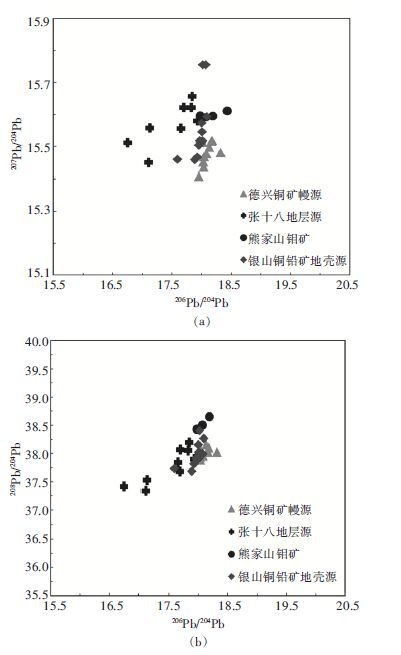 (2) 硫和铅同位素特征表明,熊家山钼矿床成矿与燕山期花岗岩浆活动有关,成矿物质主要来源于岩浆热液,但上地壳岩石也可能提供了部分成矿物质。熊家山钼矿石铅同位素组成明显不同于具有壳幔混合源特点的德兴铜矿床和具有下地壳来源特点的银山铜铅锌银矿床,而显示岩浆作用成因和造山带铅特征,反映“熊家山钼矿床与德兴铜矿床、银山铜铅锌银矿床具有完全不同的成矿背景,熊家山钼矿不属于赣东北构造成矿区,而应归属于武夷隆起成矿带”。