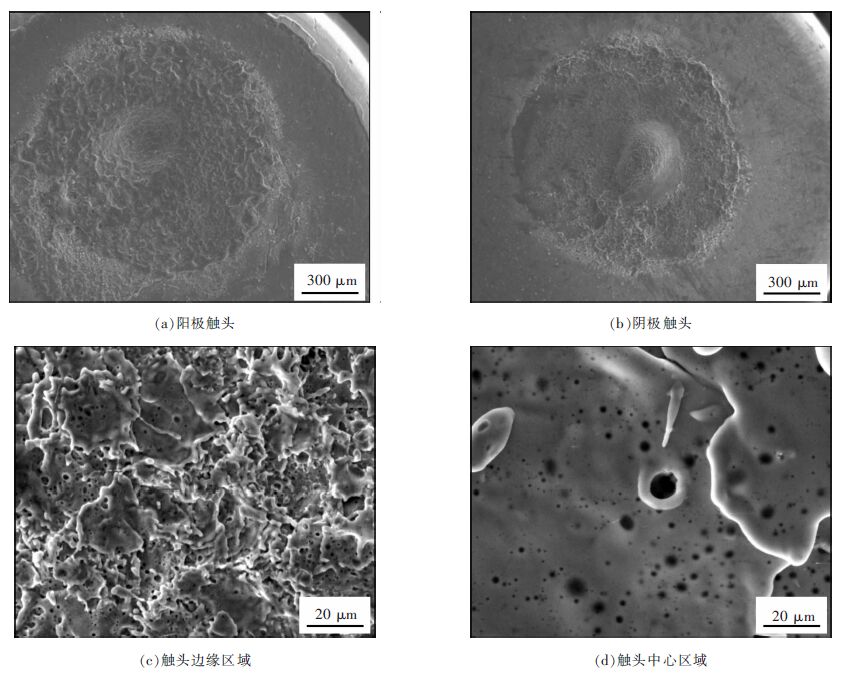 1.2 样品的性能与表征在ASTM 型电接触材料测试系统上对复合材料触点进行电弧侵蚀试验.实验的接触压力为0.6 N:负载条件为DC 20 V/20 A:触点间距为1 mm:频率为60 Hz: 分断操作次数为6 000 次. 利用电子天平测量实验前后电触点阳极和阴极的质量.利用HitachiS-3400N 型扫描电子显微镜对分断操作6 000 次后的电触点阳极和阴极进行表面形貌观察.