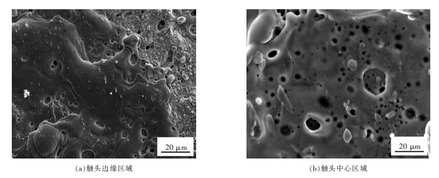 图 2为A1203/Cu 复合材料触点电弧侵蚀SEM 形貌. 由图 2 可以看出,A1203/Cu 复合材料触点不同区域存在不同的电弧侵蚀微观形貌,边缘为浆糊状凝固物特征,中心为气体啧发坑特征,这2 种形貌特征与A1203La2O3Y2O3/Cu 复合材料触点的电弧侵蚀特征基本-致.但是,综合比较图 1 与图 2 可知,A1203/Cu 复合材料触点中浆糊状凝固物铺展面积更大,中心气体啧发坑也较为密集,数量更多.大量气体啧发坑的20 μm 存在会降低触头材料的机械强度,极易引起裂纹的出现或者促使裂纹的发展.值得注意的是,在图 2(b)中明显可见气体啧发坑就是裂纹的发惊地.这说明在电弧侵蚀与机械力共同作用下,A1203/Cu 复合材料触点的啧溅更为剧烈,材料失重更大,而较多的气孔及其周围微裂纹的存在,也会加速材料的失效.因此,从触头电弧侵蚀微观形貌也可推测,A1203/Cu 复合材料的耐电弧侵蚀能力比A1203La2O3Y2O3/Cu 复合材料差.