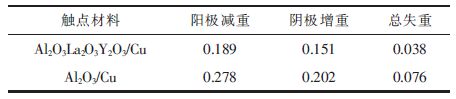 1) A1203La2O3Y2O3/Cu 复合材料触点电弧侵蚀为阳极型电弧侵蚀,即触点阳极失重,阴极增重.稀土氧2 3 化物颗粒的添加能有效抑制触头材料迁移的程度.