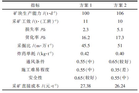 2.3 工程指标根据该矿现场实际情况,计算、评价2 方案相关工程量、矿量、采掘比、贫化率、损失率、安全性等主要指标,其结果见表1.