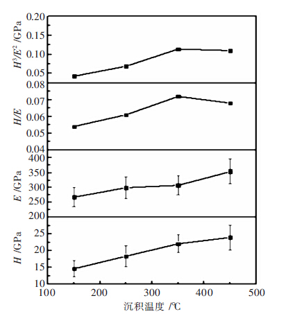 1) 随着沉积温度升高,涂层的硬度及模量呈现出 递增趋势,涂层韧性呈现出先递增后递的趋势,在沉积温度为350 ℃时达到最高.