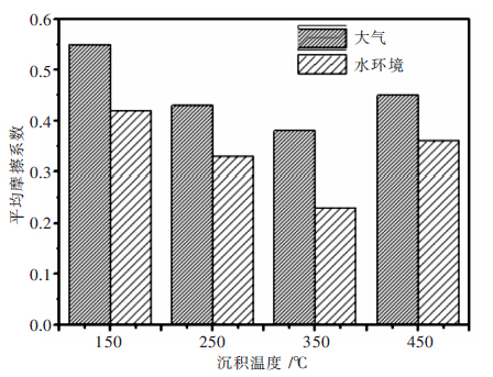 图 5为不同沉积温度下C-CN涂层在大气和水环境下的平均摩擦系数. 从图 5可知,在水的环境下,涂层的摩擦系数均低于大气环境下,这主要是水在涂层表面形成水膜,避免了涂层与摩擦 ,到一的润滑作用[16].沉积温度而言,随着沉积温度的升高,涂层在大气和水环境下 的摩擦系数均呈现出先递减后递增的趋势,在沉积温 度为350℃时达到最低,而T. Polcar等,17/研究沉积 温度为100℃到400℃内涂层的摩擦学性能,结果 发现在300℃时摩擦系数最低.这主要取决于涂层中 sp2C-C键含量,由表 1可知,沉积温度为350℃时涂 层中sp2C-C键含量达到最高.在摩擦过程中,石墨结构的sp2C-C键能有效减少表面黏着现象的发生,降低摩擦过程中的剪切应,进而降低涂层的摩擦系数[18].