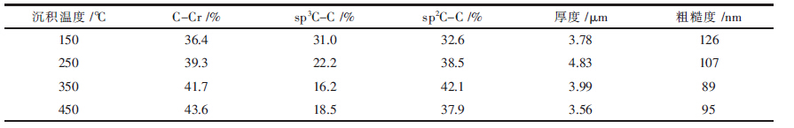 | 表1 不同沉积温度下CrC$涂层中各化学键含量、厚度及粗糙度 |