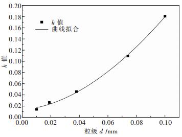 3.1.2 一阶磨矿动力学方程的建立在上述基础上,将表 3中不同粒级的磨矿动力学参数k在0.1 mm及其以下粒级进行曲线拟合,求出钨矿石的磨矿动力学参数k的表达式,结果如图 2所示.