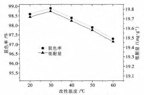 | 图 4 改性温度对酸性湖蓝A 脱色的影响 Fig. 4 Effect of modification temperature on decolorization |