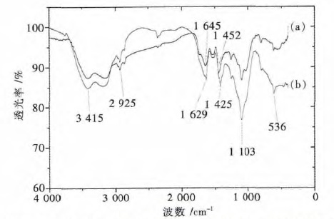 | 图 7 麦糟红外光谱图,未改性麦糟(a)和AlCl3改性麦糟(b) Fig. 7 Infrared spectra from blank spent grains and modified spent grains |