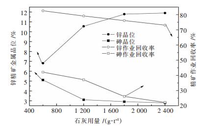 由图 10可看出,锌-硫砷分离作业中石灰可有效抑制黄铁矿和毒砂,提高锌精矿Zn品位,当石灰用量达到1 800 g/t时,锌精矿中As含量低于3%,Zn品位达到了12%左右,再增大石灰用量时,锌精矿中Zn品位上升幅度很小,所以锌与硫砷分离石灰最适用量为1 800 g/t。