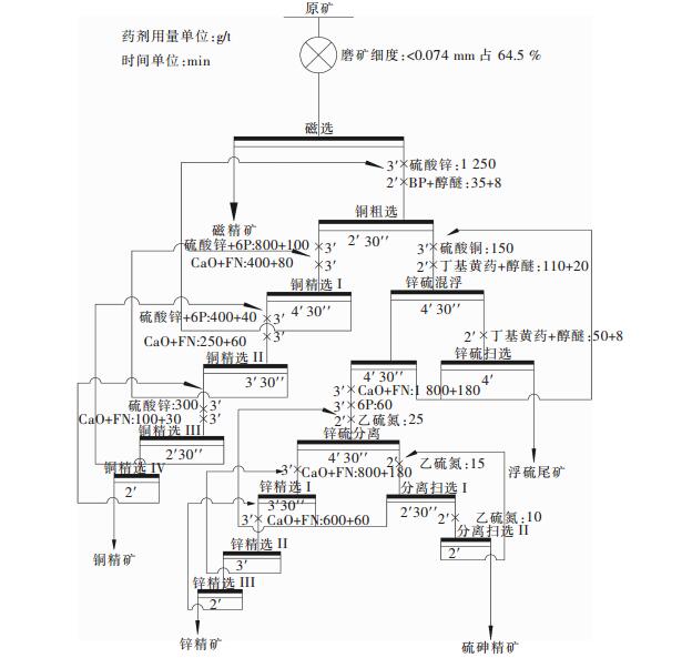 2.2.4 优化后硫化矿浮选全流程闭路试验在已有的条件试验基础上进行了优化后硫化矿浮选全流程闭路试验,全流程为磁选-优先浮铜-锌硫砷混浮-锌与硫砷分离,依此得到磁精矿、铜精矿、锌精矿和硫砷精矿4个产品。全流程闭路试验流程及药剂制度如图 11所示,所得结果如表 5所示。