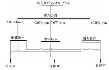 2.3 锡石重选试验指标对比现场锡重选流程较为复杂,其原则流程为水力全分级-粗砂、中粒摇床重选-细泥入悬振选矿机-中矿集中再磨-再脱硫浮选-脱硫尾矿再分级脱泥-摇床重选,该矿硫化矿浮选作业经优化后,由于浮选尾矿中S、As含量大幅度降低,可预测将有效提高已有的重选效率,并进一步简化现场锡重选流程[16]。为了对比硫化矿浮选流程优化前后对锡重选指标和产品质量的影响,故进行了简单的锡石重选不同矿样对比模拟试验,试验流程如图 12所示,所得结果如表 6所示。