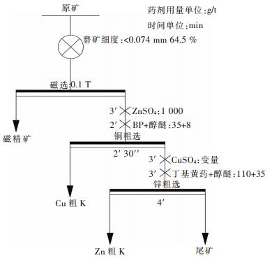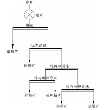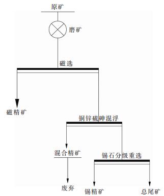 2 选矿工艺流程优化试验及结果讨论 2.1 原选矿工艺分析及原则工艺流程的确定该铜锌锡矿原生产工艺如图 2所示。其为原矿在一段粗磨条件下进入磁选作业脱除部分磁性铁,磁选尾矿进入浮选作业中,浮选为铜锌硫砷混浮工艺,流程为一粗三精两扫,得到一个含S 15%、As 8%、Cu 1%、Zn 3%左右的混合精矿,该混合精矿直接被废弃,造成了伴生金属的流失,浮硫尾矿进入分级重选作业。根据已有的工艺矿物学研究可知,该铜锌锡矿床中铜、锌的赋存状态主要为可浮性较好的硫化矿物,所以考虑将其作为综合回收的对象进行硫化矿浮选工艺确定的原则[11],由于活化后的闪锌矿难以被抑制[12-13],采用优先浮选法相比于混合浮选-铜锌分离无论是工艺流程的适用性还是药剂制度的选择上均具有优势。所以新工艺研究确定的工艺流程如图 3所示。