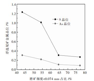 由工艺矿物学分析可知,原矿中含有部分中粒级甚至是粗粒级的黄铁矿及毒砂矿物,由于原工艺流程为了避免锡石的过粉碎,磨矿后入选细度为 < 0.074 mm54.12%,致使原矿中部分硫砷矿物未能单体解离而随脉石矿物进入锡石重选作业之中。为了提高硫化矿浮选作业中硫化物浮选效率,需对原有的磨矿细度重新调整,磨矿细度条件试验流程如图 4所示,以硫化矿尾矿中S、As含量为参照,所得试验结果如图 5所示。