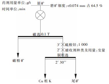 2.2.2 优先浮铜优先浮铜捕收剂种类条件试验.在确定了优先浮铜的工艺流程后,在铜粗选作业中不仅需要添加其它矿物的抑制剂,对铜有特效捕收剂的选择也是优先浮选工艺成功的关键[14]。铜优先浮选捕收剂种类条件试验流程如图 6所示,所得结果如图 7所示。