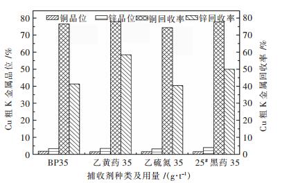 | 图 7 优先浮铜捕收剂种类条件试验结果 Fig. 7 Results of condition tests for types of collectors in Cu differential flotation |