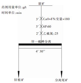 2)锌-硫砷分离石灰用量条件试验.为了得到达入冶标准的锌精矿产品,需对锌硫砷混合精矿进行锌与硫砷分离作业。常规锌-硫砷浮选分离作业采用“重压轻拉”原则,即加入大用量的石灰等抑制剂实现对目的抑制矿物的充分抑制,再加选择性好、捕收能力弱的捕收剂浮选分离闪锌矿。锌-硫砷分离的关键在于抑制剂用量对分离效率的影响,锌-硫砷分离石灰用量条件试验流程如图 9所示,图 9给矿为锌硫混浮Zn粗K,FN为腐殖酸钠,6P为六偏磷酸钠,所得结果如图 10。