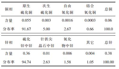 对原矿中的铜、锌进行物相分析,得到铜、锌金属的存在形式及分配状态如表 3所示。