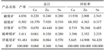 3)采用磁选除铁-优先浮铜-锌硫混浮-锌硫分离流程处理该铜锌锡矿,在合适的药剂用量条件下,可得到如下指标: