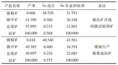 对比表 6中不同矿样在相同的流程下所得的选矿指标可知,硫化矿浮选流程优化后的浮硫尾矿重选所得锡精矿品位和作业回收率,要高于现场生产矿样试验指标。同时从表 6可看出,优化后的浮硫尾矿经重选后所得锡中矿的品位和产率,明显低于现场生产所得的浮硫尾矿,可知前者重选的效率明显高于后者。同时对2个精矿都进行多元素分析,硫化矿优化后的浮硫尾矿,经重选所得的锡精矿含S 1%、As 0.15%,而现场生产浮硫尾矿经重选所得的锡精矿含As 0.6%,该结果也印证了经优化后的浮选流程,对后续锡石重选在提高锡精矿品质的作用。
