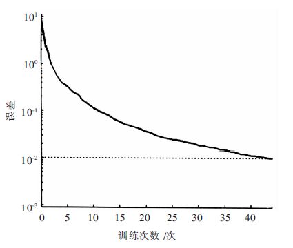 首先将表 2数据进行归一化处理,随机抽出1、2、13、16、27组作为预测样本,其余55组数据建立训练样本并训练,训练函数采用TRAINSCG(共轭梯度法),得到神经网络模型训练误差曲线图,如图 2所示. 由图 2可知,采用TRAINSCG误差收敛较快,在训练40步时,误差收敛.将训练好的神经网络对随机样本1、2、13、16、27进行预测,得到样本预测与实际绝对误差(表 3),最大绝对误差为0.01,最小为0.001,预测输出与实际数据较为吻合,可以满足工程需求.