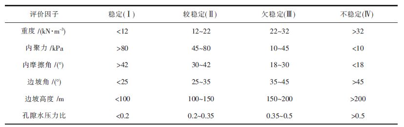 当孔隙压力比小于0.2、边坡高度小于25 m、边坡角小于25 °、内摩擦角大于42 °、内聚力大于80 kPa、重度小于12 kN/m3时,边坡处于稳定状态;当孔隙压力比大于0.5、边坡高度大于200 m、边坡角大于45 °、内摩擦角小于18 °、内聚力小于10 kPa、重度大于30 kN/m3时,边坡处于不稳定状态.