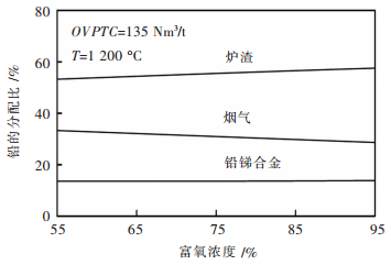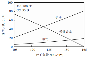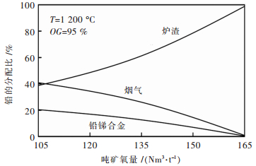 数据表明,随着吨矿氧量的增大,铅进入烟气和铅锑合金的比例不断下降,而进入炉渣的比例不断上升,说明吨矿氧量较低时,铅主要以PbS形式进入烟气或以金属Pb形式进入合金,而随着吨矿氧量的增大,铅不断被氧化成PbO而进入炉渣.