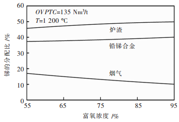 | 图 2 吨矿氧量对锑在各相分配比的影响 Fig. 2 Effect of oxygen volume per ton concentrate on antimony distribution rate in smelting produces |