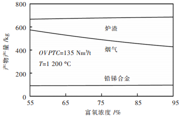 | 图 5 富氧浓度对各相产出量影响 Fig. 5 Effect of oxygen grade on smelting produces output |