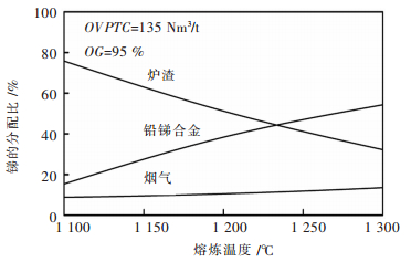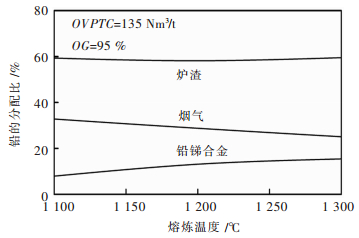 3.3 熔炼温度的影响图 6和图 7分别示出一定吨矿氧量和富氧浓度情况下,熔炼温度在1 100~1 300 ℃之间变化时,铅和锑在铅锑合金、炉渣和烟气平衡相中分配比的变化情况.