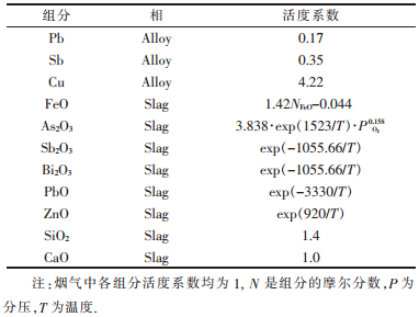 根据脆硫铅锑冶炼原理及现有工艺生产实践,脆硫铅锑闪速熔炼产物共有三相:铅锑合金相、炉渣相和烟气相.平衡时各相可能含有的主要组分如下: