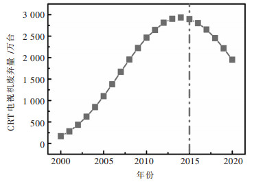 彩色电视机包括CRT电视机、平板电视机(PDP电视机、LCD电视机),平板电视机从2005年开始进入我国市场,并逐渐取代CRT电视机,到2015年,CRT电视机将完全被取代.从图 2可知2015年CRT电视机废弃量达到峰值2 900万台,但2016~2020年,CRT电视机废弃量仍较大,2020年该数值为1 950万台,2010~2020年,CRT电视机废弃量累计约4亿台.