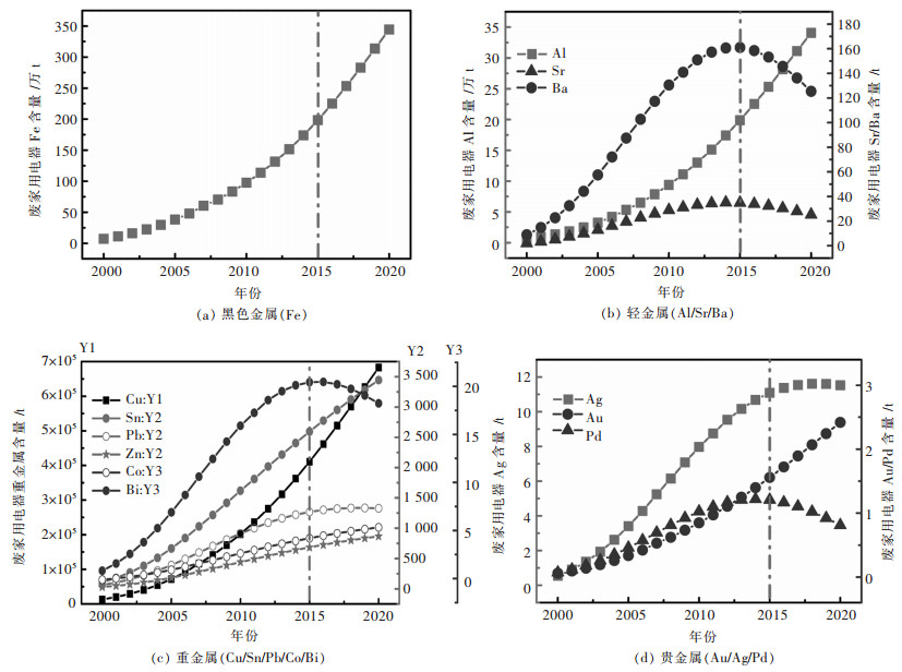 家用电器废弃物中贵金属回收极具经济价值,金呈现增长趋势,银、钯呈现先增长,后减少的趋势. 2020年家用电器废弃物中含金量超过2 t,含银量超过11 t.而2000~2020年家用电器废弃物中含金、银、钯累积量分别达到21 t、150 t、16 t;