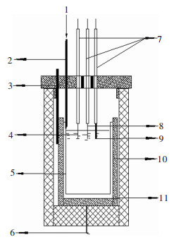| 1.氩气; 2.保护管; 3.耐火砖; 4.钨丝; 5.铁坩埚; 6.热电偶; 7.刚玉管; 8.铂丝; 9.石墨; 10.石墨坩埚; 11炉膛 图 1 实验装置 Fig. 1 Experimental dvice |