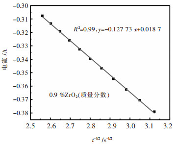式(4) 中:I为电流强度;n为转移电子数;F为法拉第常数;A为研究电极表面积,1.256 cm2;C0为反应物Z4+浓度,3.6×10-4 mol/cm3;D为扩散系数;π为圆周率;t为电解时间.取电位-1.1 V计时电流曲线电流下降阶段的数据I与t-1/2作图,如图 10所示.