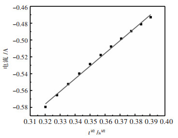 电流I与时间t-1/2呈良好的线性关系, 与Cottrell方程相吻合.对图 10中数据进行线性拟合得到关系式y=-0.127 73x+0.018 7.直线斜率(nFAD1/2C0)/π1/2为-0.127 73, 代入其他定量数值计算求得扩散系数D为6.7×10-6 cm2/s.